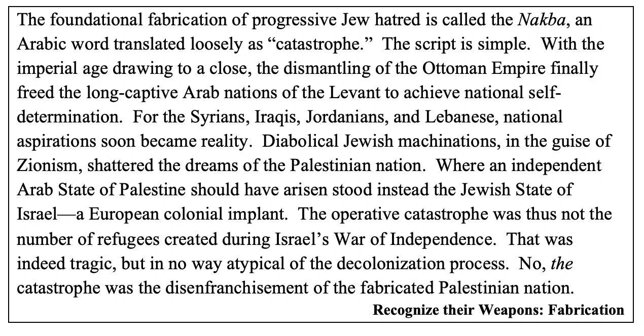 Bingo! The anti-Zionist Nakba myth cast Jews seeking self-determination in their historic homeland as a foreign colonial power — just as the world turned away from colonialism. It cast as privileged White Europeans the oppressed Jews that Europe had sought to exterminate for being non-Europeans. It cast as invaders the Jews that Islam had relegated to second-class citizenship and then expelled. It cast as a long-captive proud nation the Arabs living in Palestine, who had never before seen themselves as an entity distinct from the other Arabic speakers of the Levant. It leveraged a recurrent them of Jew hatred, namely that whatever property the Jews hold must be stolen from their more righteous neighbors. The Nakba myth depicted the Jews as an invading white horde suppressing the legitimate self-determination of a downtrodden brown people and stealing their home. It’s hard to think of a defamation more damning in the progressive moral universe.